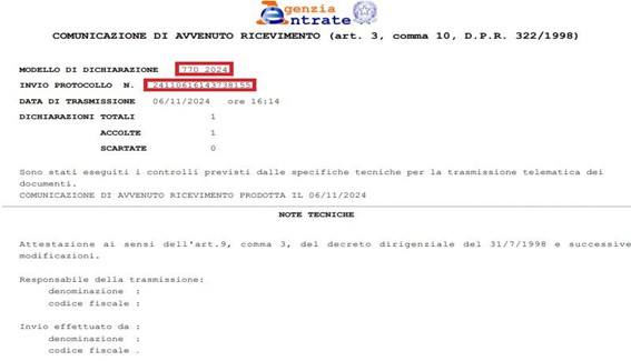 −    L’ultima ricevuta di invio 770 anno 2024 dalla quale si può reperire il numero di protocollo ed il relativo numero progressivo come da esempio sottostante: